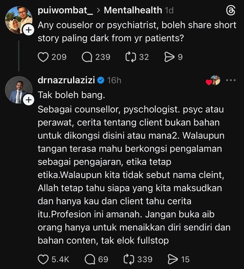 Dalam respons ringkas tetapi tegas, Dr. Nazrul Azizi menegaskan bahawa kisah pesakit bukan bahan untuk dikongsi di media sosial, walaupun tanpa menyebut nama. Menurutnya, sebagai kaunselor, psikologis, psikiatri atau jururawat, setiap cerita yang dikongsi oleh klien merupakan amanah yang perlu dijaga dengan penuh tanggungjawab.
