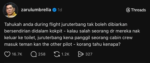 Perkongsian bekas pramugara yang juga seorang penyanyi, Zarul Umbrella di Threads mengenai juruterbang menarik perhatian ramai. Menurut Zarul, juruterbang tidak boleh ditinggalkan bersendirian di ruangan kokpit ketika penerbangan. Persoalannya, kenapa juruterbang tak boleh dibiarkan bersendirian walaupun sekejap?