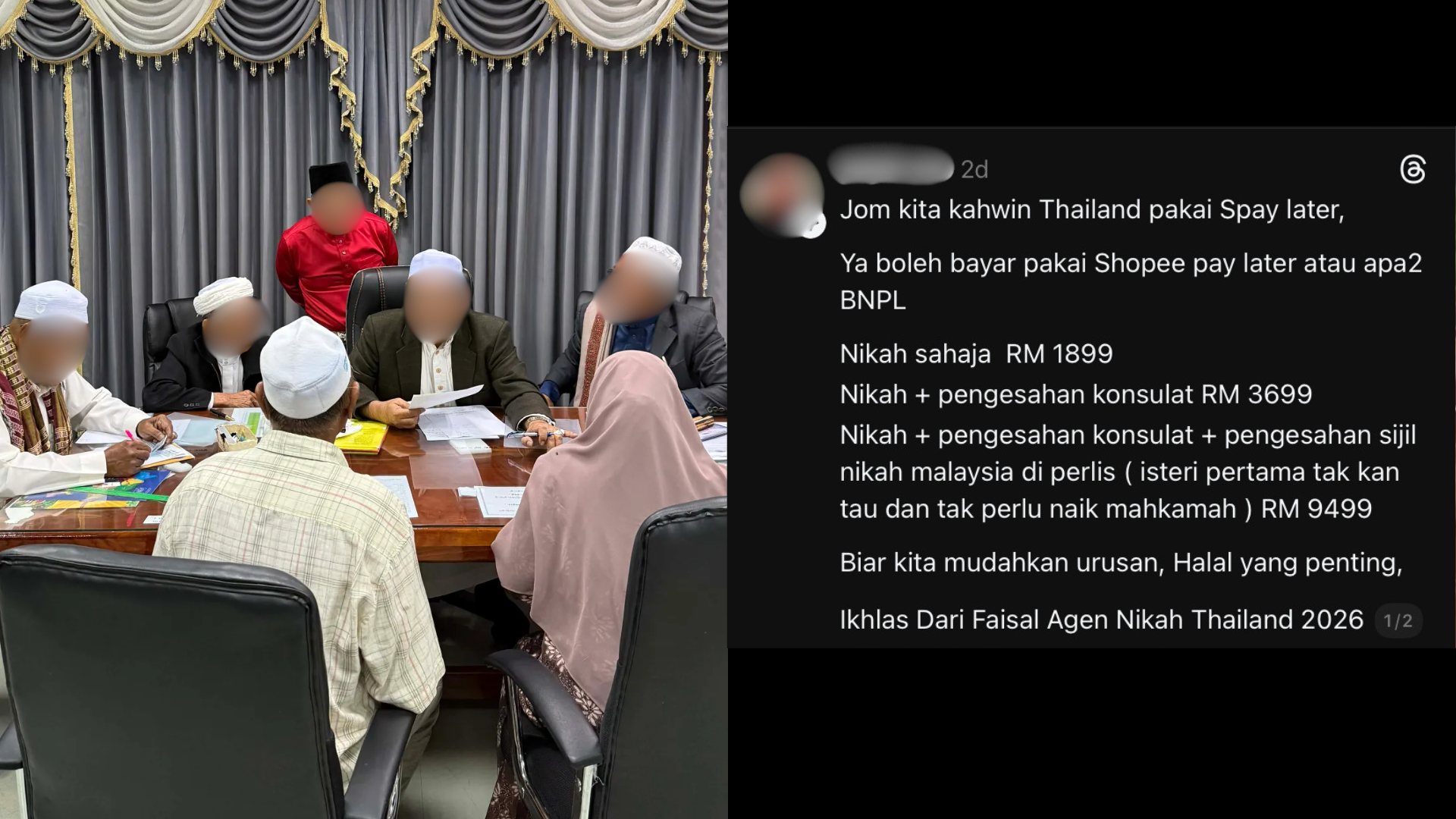 Sebuah hantaran di Threads menarik perhatian ramai selepas seorang individu yang mendakwa sebagai ejen pernikahan di Thailand menawarkan pakej kahwin dengan pilihan bayaran secara tertangguh atau ‘pay later’.