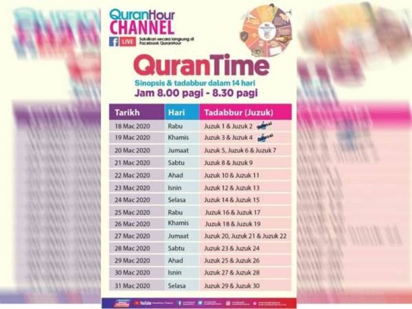 Sepanjang tempoh Perintah Kawalan Pergerakan, orng ramai diajak untuk mengikut Siri Sinopsis dan Tadabbur 30 juzuk al-Quran selama 30 secara online di laman sosial Facebook QuranHour setiap 8 pagi.